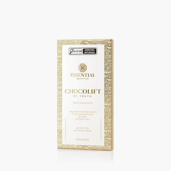 Chocolate branco sem lactose, sem adição de açúcar e formulado com whey protein isolado e colágeno hidrolisado em peptídeos, além de fibras, leite de coco e adoçantes naturais.