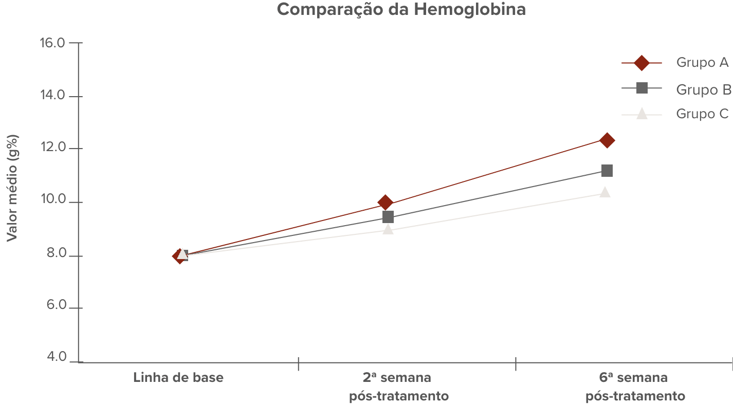 – Grupo C (n=50) recebeu injeção intramuscular com 75mg/dia de ferro sorbitol por 13 dias (totalizando 1000mg).