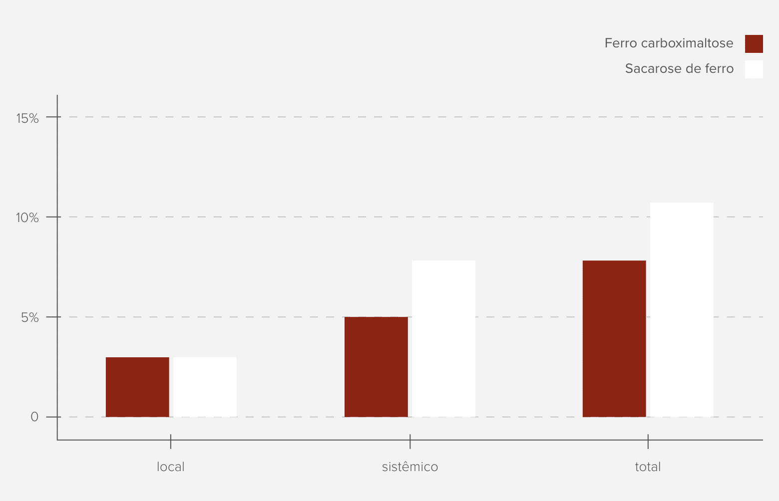 Em relação à ocorrência de efeitos adversos, outro estudo comparativo analisou a ocorrência de eventos locais e sistêmicos, após a administração intravenosa de ferro carboximaltose e ferro sucrose. Os resultados encontram-se na imagem a seguir: