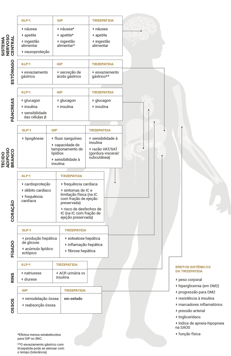 Essa ação potencializa a secreção da insulina, inibe a liberação de glucagon, retarda o esvaziamento gástrico e aumenta a saciedade, fatores que contribuem para o controle da glicose, favorecem a redução significativa do peso e ainda trazem efeitos positivos sobre a saúde cardiovascular e renal.