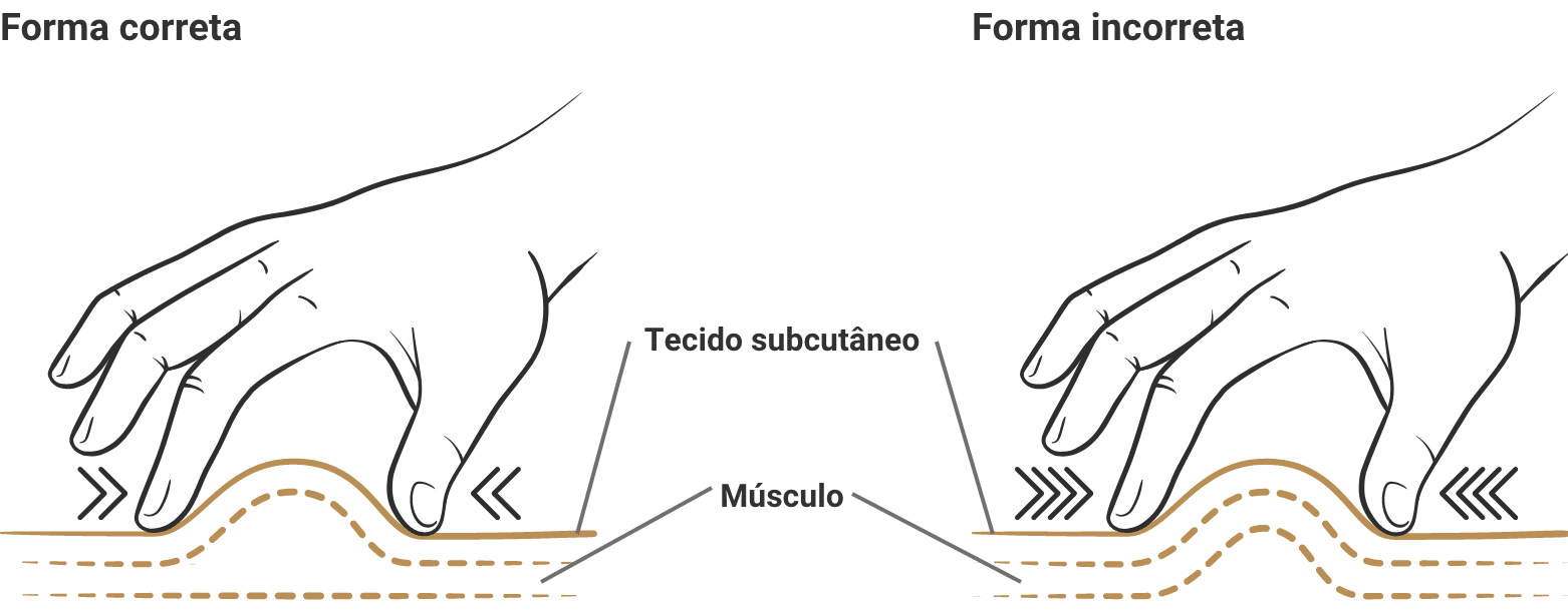 Conforme ilustrado na figura 2, faça o movimento de pinça suavemente com a mão e segure apenas a camada superficial da pele. Dessa forma, a aplicação alcançará exclusivamente o tecido subcutâneo, garantindo que o tratamento seja seguro e eficaz.